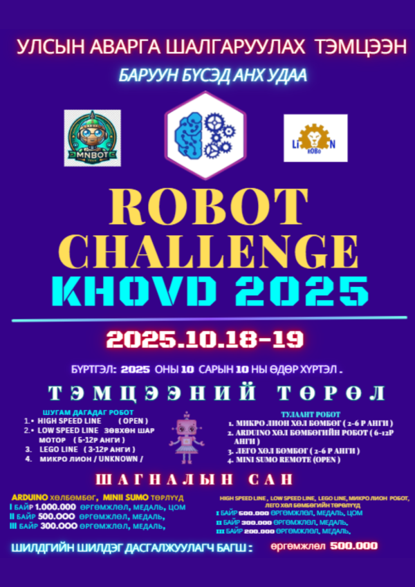 Микро-Лион Роботын Тэмцээн нь сурагч, оюутнуудад роботын инженерчлэл, программчлалын мэдлэгээ сорих, бүтээлч сэтгэлгээгээ хөгжүүлэх боломж олгодог улсын хэмжээний тэмцээн юм. Багууд өөрсдийн зохион бүтээсэн роботын удирдлага, хурд, нарийвчлал, ухаалаг шийдлээр өрсөлдөж, шилдгүүд олон улсын тэмцээнд оролцох эрхтэй болно.