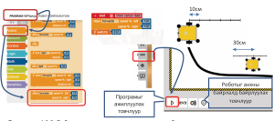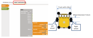 Даалгавар 1.3. “Open Roberta Lab” симуляцийн орчинд хоёр дугуйтай роботын дугуйны радиусыг 5.6 см, дугуй хоорондыг зайг 18 см байхаар роботыг загварчлан, роботыг эхлэх цэгээс 30 см урагш явахаар тооцоолон програмын кодыг бич.