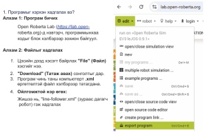 Бүгдээрээ нээлттэй-Роберта лабораториийн / https://lab.open-roberta.org/ Open Roberta Sim E.V3 IeJOS 0.9.1 симуляцмийн талбарыг ашиглан програм бичицгээе.