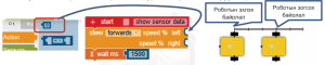 Даалгавар 1.3.3. Роботын явах хугацааг 600 милсекундээс их, роботын хурдыг 70 хувиас бага байхаар тохируулан програмын кодыг бич.